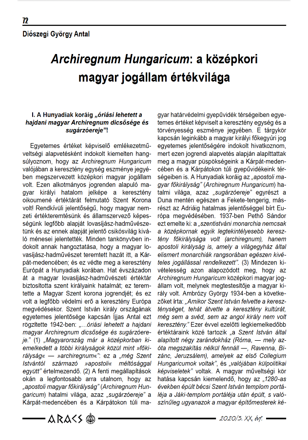 Diószegi György Antal Archiregnum Hungaricum: a középkori magyar jogállam értékvilága