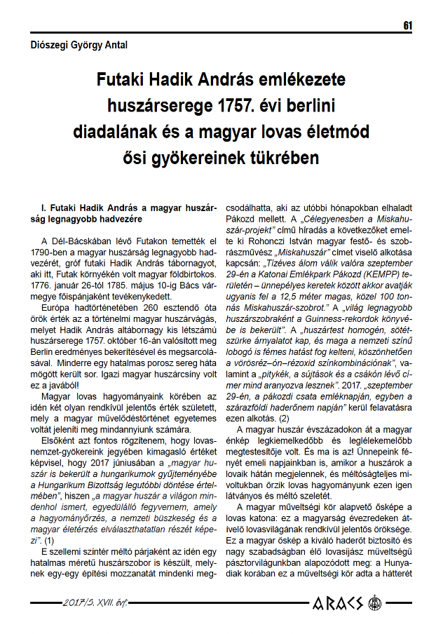 Diószegi György Antal Futaki Hadik András emlékezete huszárserege 1757. évi berlini diadalának és a magyar lovas életmód ősi gyökereinek tükrében